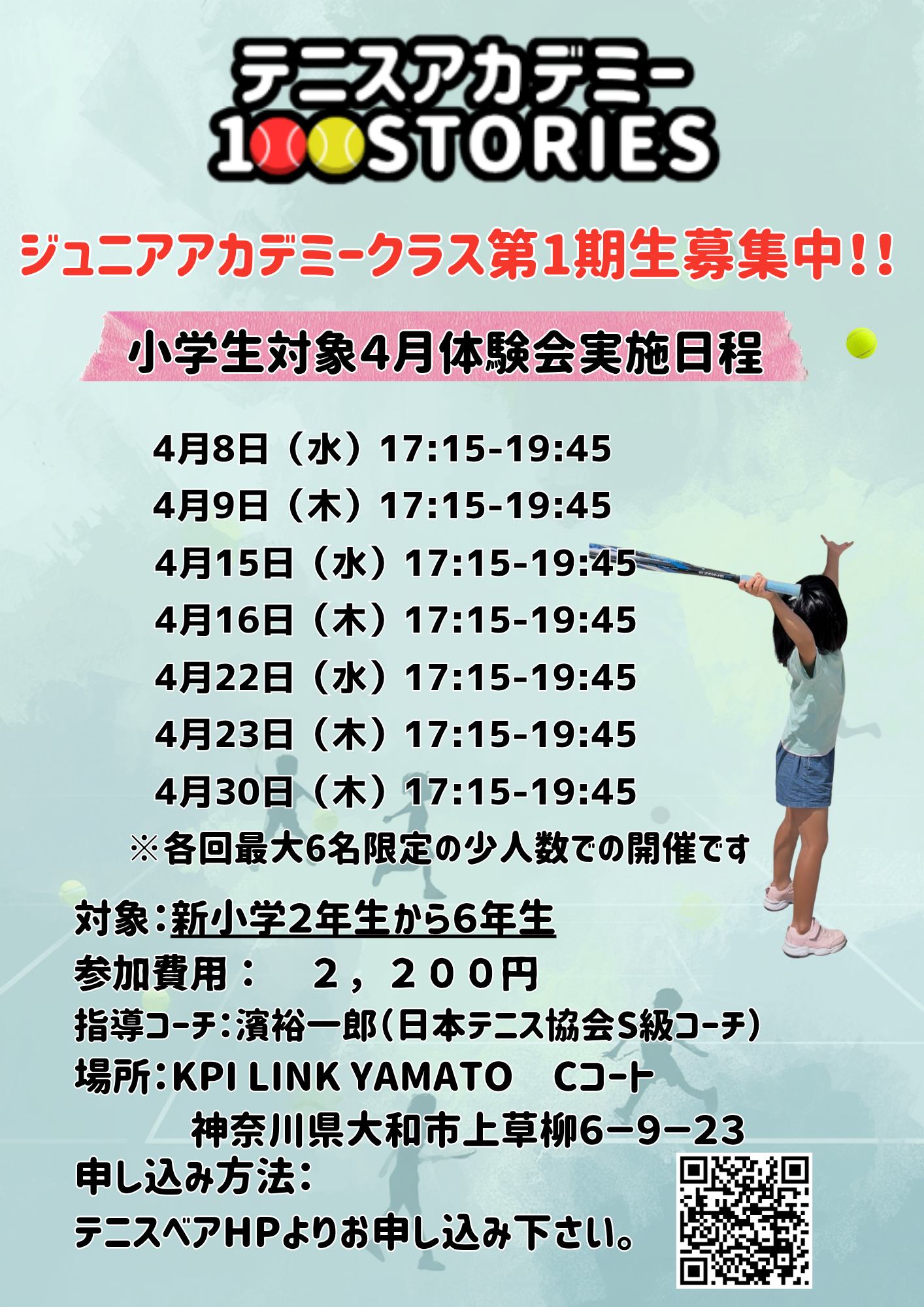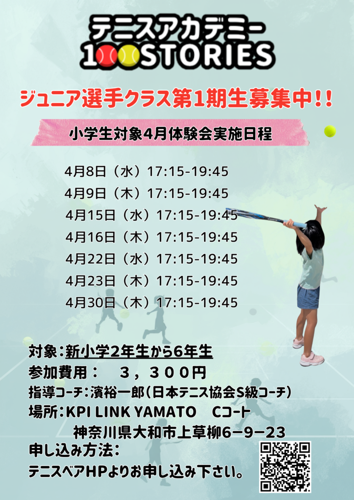 テニスアカデミー100STORIESのジュニアクラスの体験会を行います。